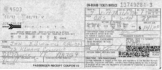2. Into the trip, I decided to visit the cafe car and pick up a snack or two. As I had arrived in the US with very little time to pick up some US Cash (I had Canadian Currency, which I knew would be unacceptable from the get go), I wanted to pay with my Visa card. The gentleman handling the cafe car was quite gruff with me when I asked if I could pay for a couple smaller items (a sandwich and a soda) with my Visa card. He said I couldn't use it. Only after prompting him did I find out that I could use it, but only on balances over $10. A fair policy, but nowhere did I see this policy listed in the 1997 (and 1998) Amtrak Travel Planners, or on any of the signs in the cafe car. I also inquired as to making the balance out for $30.00 on the card and giving me back change, and he replied (rather rudely I might add) no, and that he wasn't a bank. This is done in some circumstances here in Canada on Visa... And, after gathering enough items to actually use the Visa card did he insult me by asking if this was a real Visa card. My Visa card is issued by the CIBC, one of the big six banks in Canada, and has a slightly lower number of digits than most Visa cards. After working as a cashier in a grocery store in a tourism based town, I've seen a good number of different Visa cards. At NO time did I ever question a customer when they handed me a card which had a valid Visa logo on it. For the remainder of the trip to Sacramento, I felt quite uncomfortable in going down to the Cafe car because of his personality. A second time, I went down and this time I had cash on hand. He was slightly nicer that time, but his efficiency and speediness certainly was a little disconcerting.