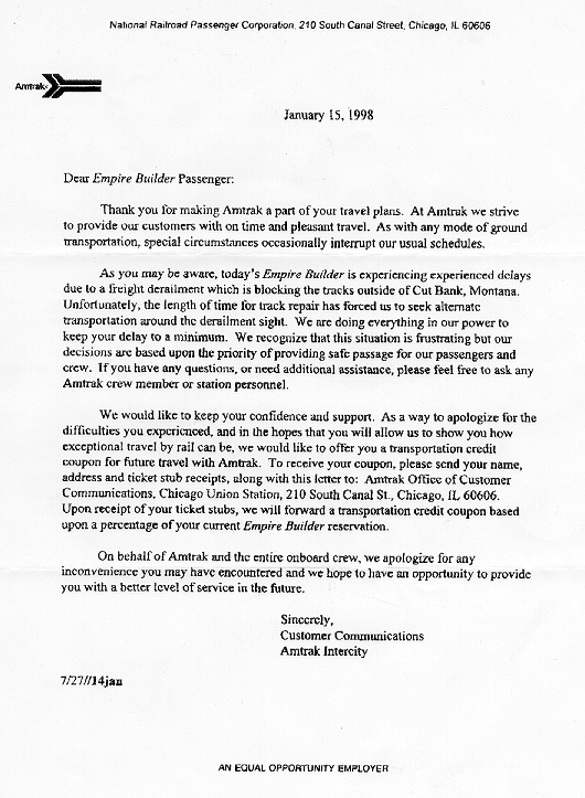 I was delayed 12 hours on getting into Seattle from Chicago onboard the Empire Builder...This was time that wanted to spend with a friend, and also to tour around the city and basically be a tourist. I'm enclosing the letter which was given to me by the Chief. I'm also enclosing the ticket stubs, and a photocopy of the receipt for my upgrade to a Sleeper (the time I actually spent in my private accommodations was severely cut short by the need to move us from the train to the busses, and the destination for the busses was Whitefish...the destination where I would be moving from my Standard bedroom back to my coach seat...I do trust you will take the upgrade into consideration when you process the transportation credit which I will be expecting from you.